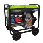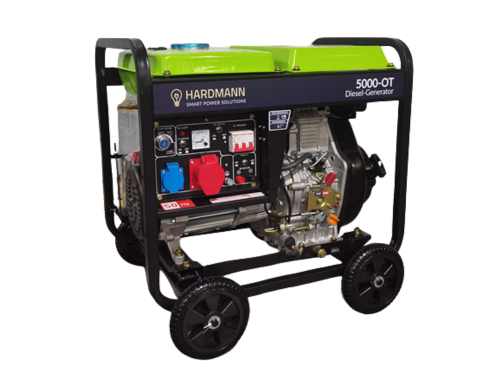 1) Diesel-Generator HARDMANN 5000-OT (5 kW, 3-Phasen) Der HARDMANN 5000-OT ist ein robuster 3-Phasen-Dieselstromerzeuger und das Herzstück dieses Notstromaggregats für das Haus. Mit einer Maximalleistung von 5.000 W, stabilem 50-Hz-Betrieb und automatischer AVR-Spannungsregelung liefert er auch bei wechselnder Last konstant sauberen Strom – ideal für Heizungssteuerung, Kühlschrank, WLAN-Router und Beleuchtung gleichzeitig. Angetrieben wird der Generator von einem luftgekühlten 4-Takt-Dieselmotor (Typ S188FBE, 456 ccm, bis 9,2 PS) mit komfortablem Elektrostarter – ein einfacher Knopfdruck genügt. Der integrierte 12,5-Liter-Dieseltank mit Tankanzeige ermöglicht einen effizienten Betrieb bei ca. 1,25 l/h (75 % Last). Die Anschlüsse umfassen 400 V CEE 16A, 230 V Schuko sowie 12 V DC (8,3 A) – für nahezu jedes Haushaltsgerät geeignet. Das stabile Stahlgerüst mit Fahrgestell und Rollen sorgt für einfache Mobilität. Ersatz- und Verschleißteile sind dauerhaft verfügbar.