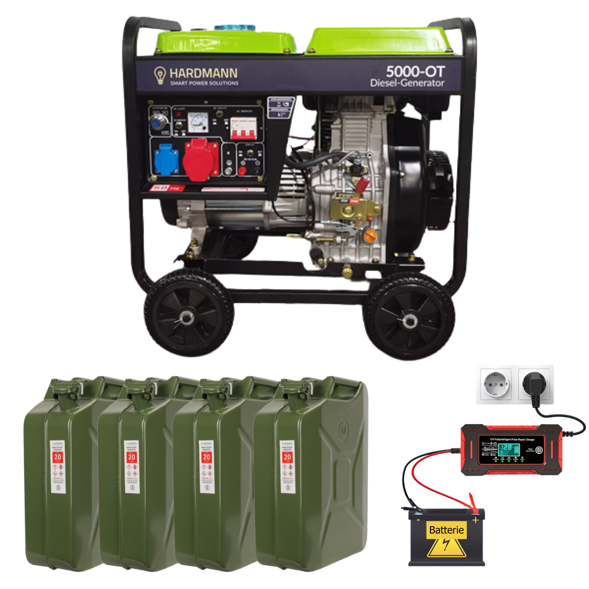 2) 4 × 20-Liter Kraftstoffkanister (Olivgrün, UN-zertifiziert) Zum Notstromaggregat für den Privathaushalt gehört zwingend eine sichere Kraftstoffreserve. Die vier mitgelieferten 20-Liter-Kanister aus pulverbeschichtetem Stahl (0,8 mm Wandstärke) mit kraftstoffbeständiger Innenversiegelung schützen zuverlässig vor Rostbildung. Die UN-Zertifizierung nach europäischen Normen garantiert höchste Transportsicherheit. Der Sicherheitsverschluss mit Gummidichtung sowie der Metall-Ausgießer mit flexibler Plastiktülle machen das Befüllen des Generators sauber und unkompliziert. Mit insgesamt 80 Litern Kraftstoff erreichen Sie eine Laufzeit von über 100 Stunden – das entspricht mehr als 4 Tagen durchgehender Notstromversorgung für Ihr Zuhause. 💡 Diesel oder Heizöl – was darf ich tanken? Der HARDMANN 5000-OT kann wahlweise mit Diesel (EN 590) oder Heizöl EL (nach DIN 51 603-1) betrieben werden. Der Betrieb mit steuerbegünstigtem Heizöl ist für stationäre Notstromaggregate nach § 3 Abs. 1 EnergieStG ausdrücklich erlaubt – da der Generator ausschließlich der Stromerzeugung dient und während des Betriebs an seinem Standort verbleibt. Wer ohnehin eine Ölheizung zu Hause hat, kann also denselben Vorrat für Heizung und Generator nutzen – ein erheblicher praktischer Vorteil im Blackout-Fall.